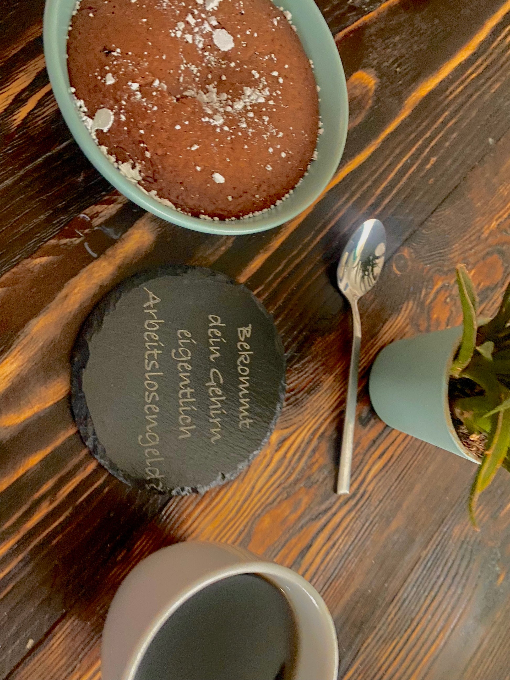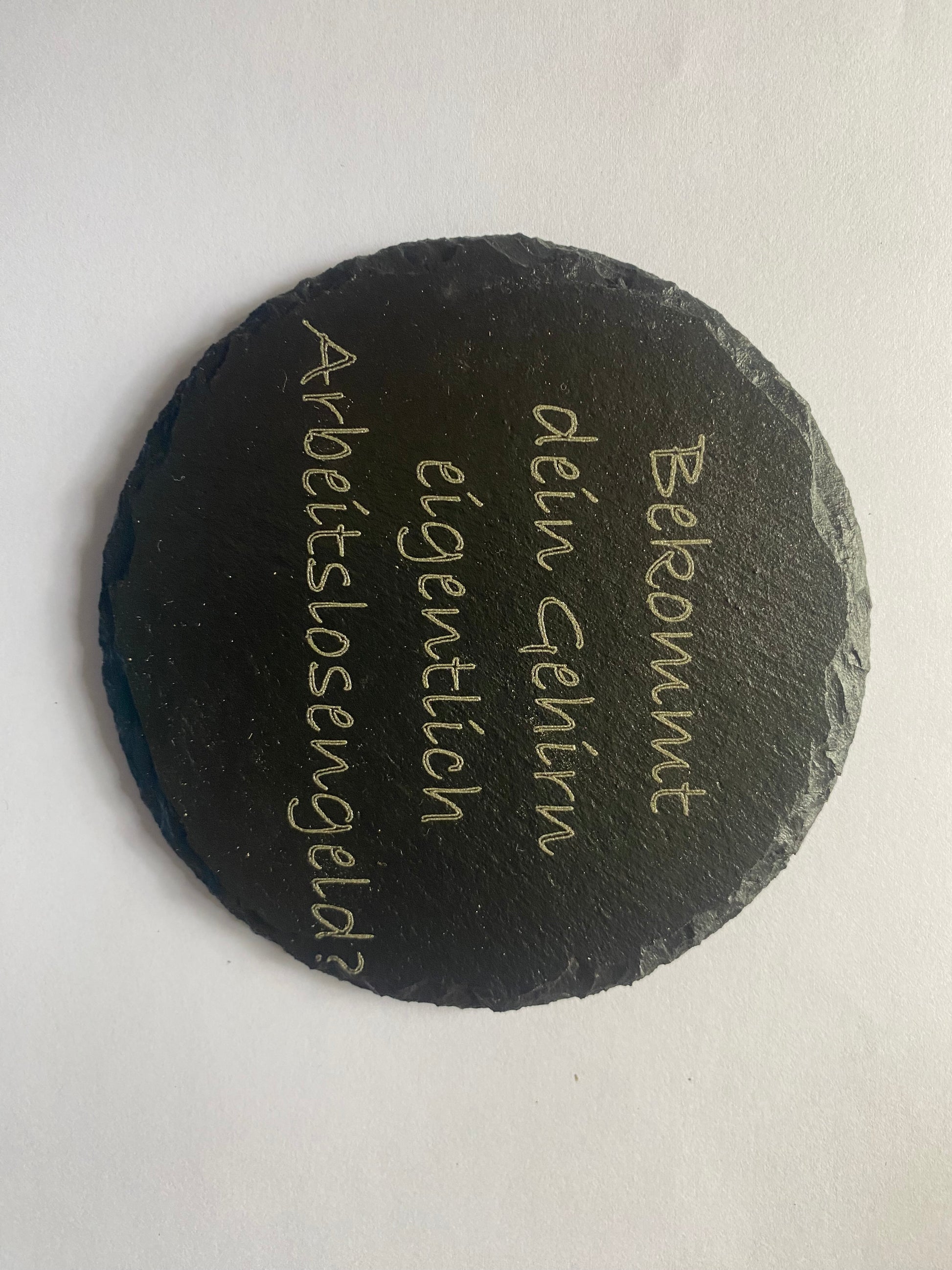 Laser gravierte Untersetzer aus naturbelassenem Schiefer. Auf der Unterseite befinden sich Moosgummi-Pads, um den Untergrund zu schützen.