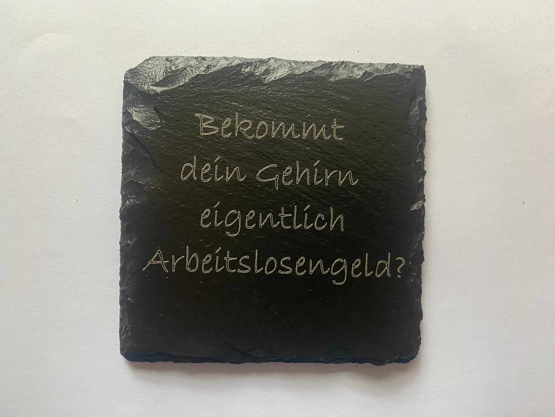 Dieser Untersetzer wird mit dem Spruch „Bekommt dein Gehirn eigentlich Arbeitslosengeld?“ geliefert. Perfekt als Geschenk für die Arbeitskollegen oder gute Freunde.