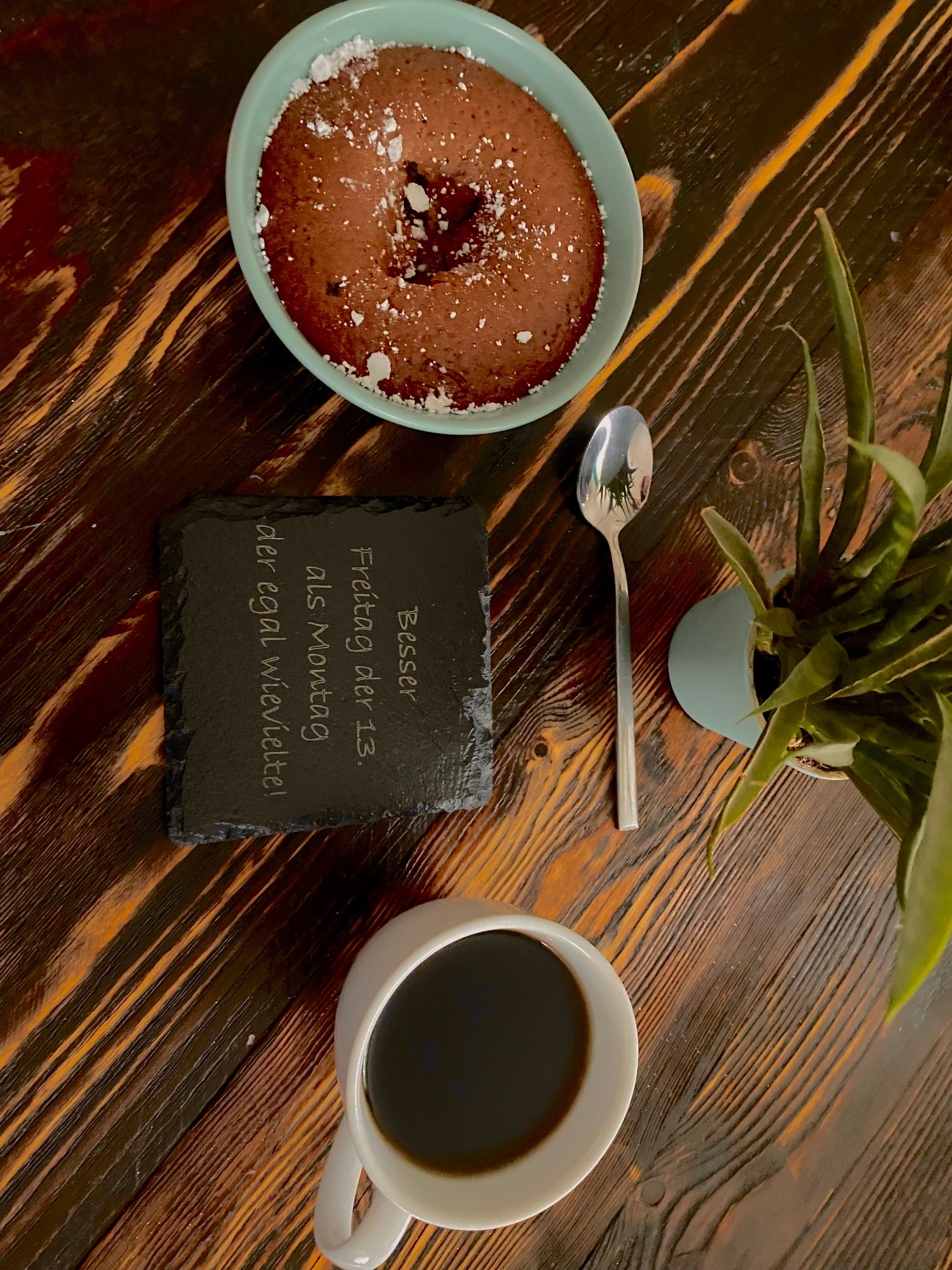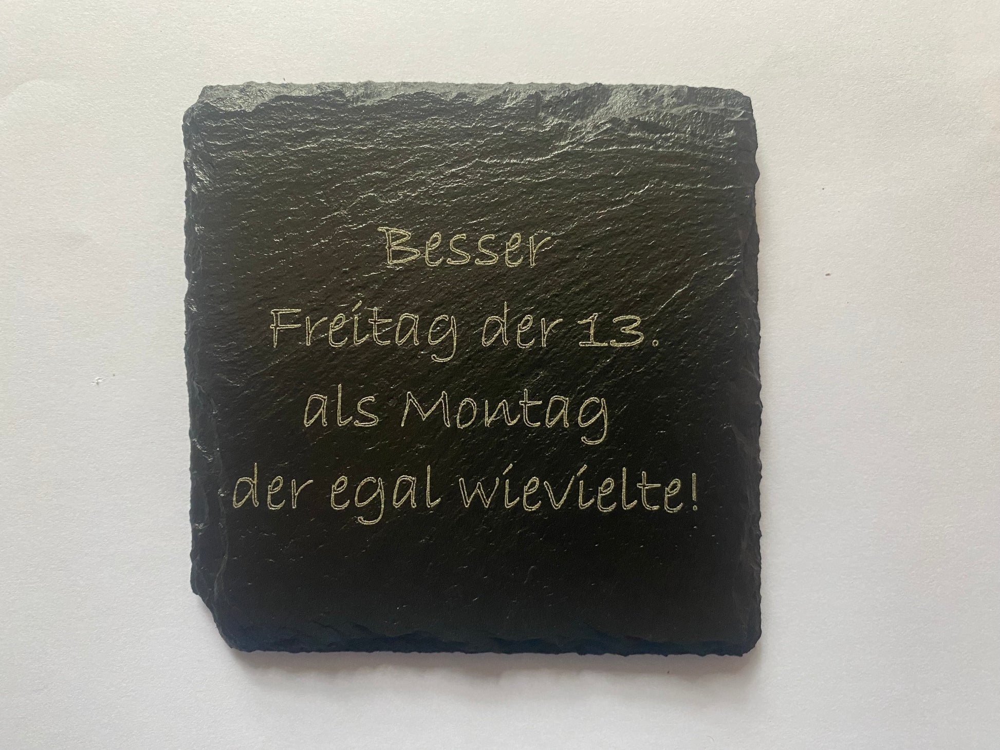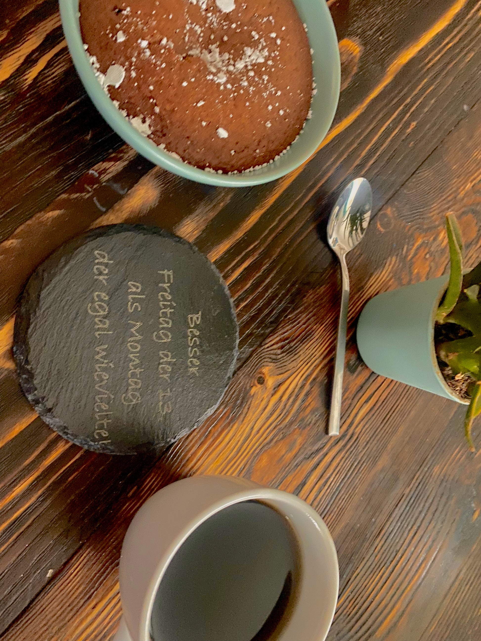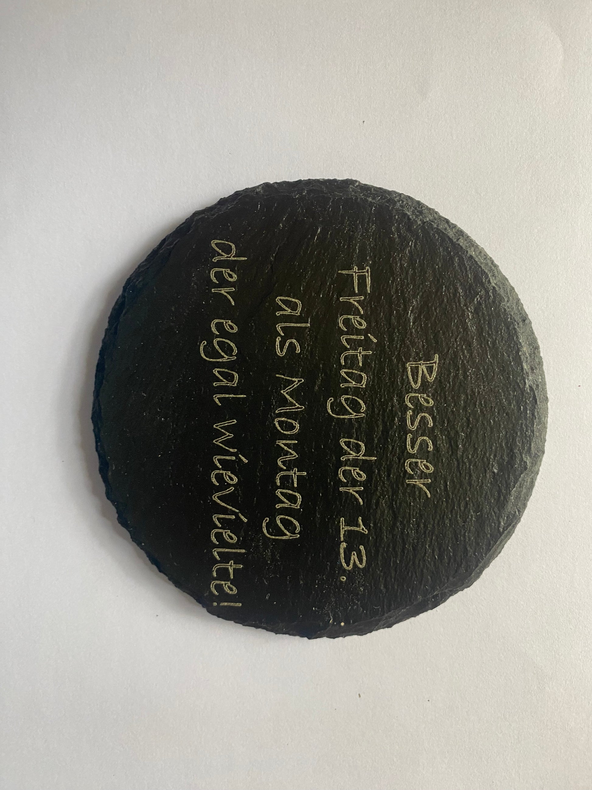 Laser gravierte Untersetzer aus naturbelassenem Schiefer. Auf der Unterseite befinden sich Moosgummi-Pads, um den Untergrund zu schützen.